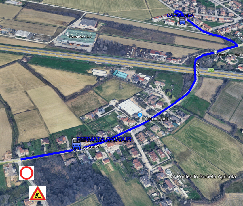 Via Cavour rimarrà ancora interdetta per lavori stradali indicativamente fino a marzo 2026, perciò si continuerà dritti lungo via Pontealto, transitando sopra il viadotto autostradale.