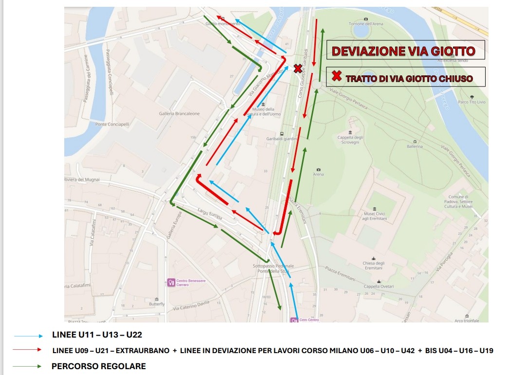 - Tutte le corse provenienti dalla Ferrovia con instradamento previsto verso via Giotto, anziché svoltare a destra su via Giotto, dovranno proseguire dritto lungo Corso Garibaldi e, svoltare a destra in Largo Europa, via Matteotti per raggiungere via Giotto. Per quanto riguarda il percorso di ritorno non sono previste variazioni.
